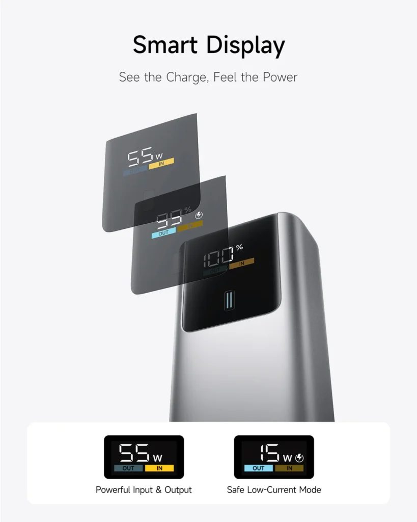 Gracias a su pantalla a color, se puede ver fácilmente si la batería está cargando algún dispositivo o si está recibiendo energía. Pero también la potencia de carga o si está activado el modo de baja corriente, muy útil cuando queremos cargar dispositivos más “sensibles” como smartwatches o auriculares.