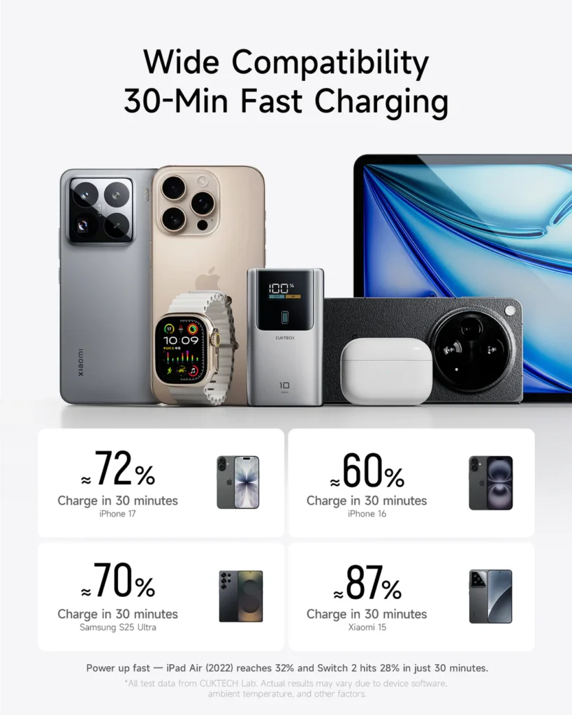 Nos ha llamado la atención que esta batería portátil de CUKTECH puede cargar varios dispositivos al mismo tiempo, incluyendo un smartphone y un portátil. Además, puedes estar cargando un dispositivo y, al mismo tiempo, recargando la batería gracias al Modo Pass-Through. Todo ello aporta eficiencia a nuestro día a día: nos permite seguir adelante sin preocuparnos por la batería.